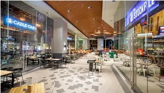 Cable car ortigas have a high ceiling where there is also a seating area for diners just above their bar.